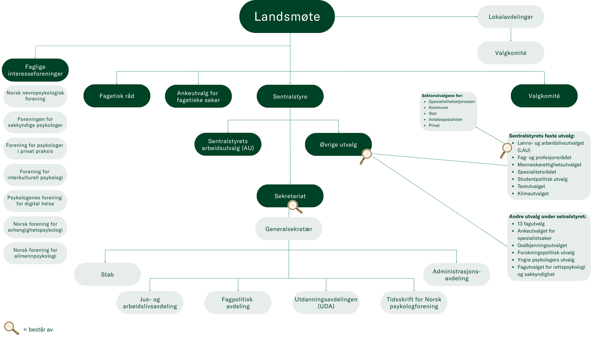 Vi har også mange forskjellige råd, utvalg og faglige interesseforeninger, med ulike ansvarsområder og mandater.